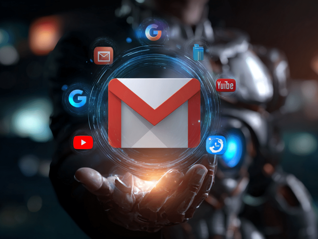Hände halten eine leuchtende digitale Sphäre mit globalen App-Symbolen, darunter Gmail, YouTube und Google